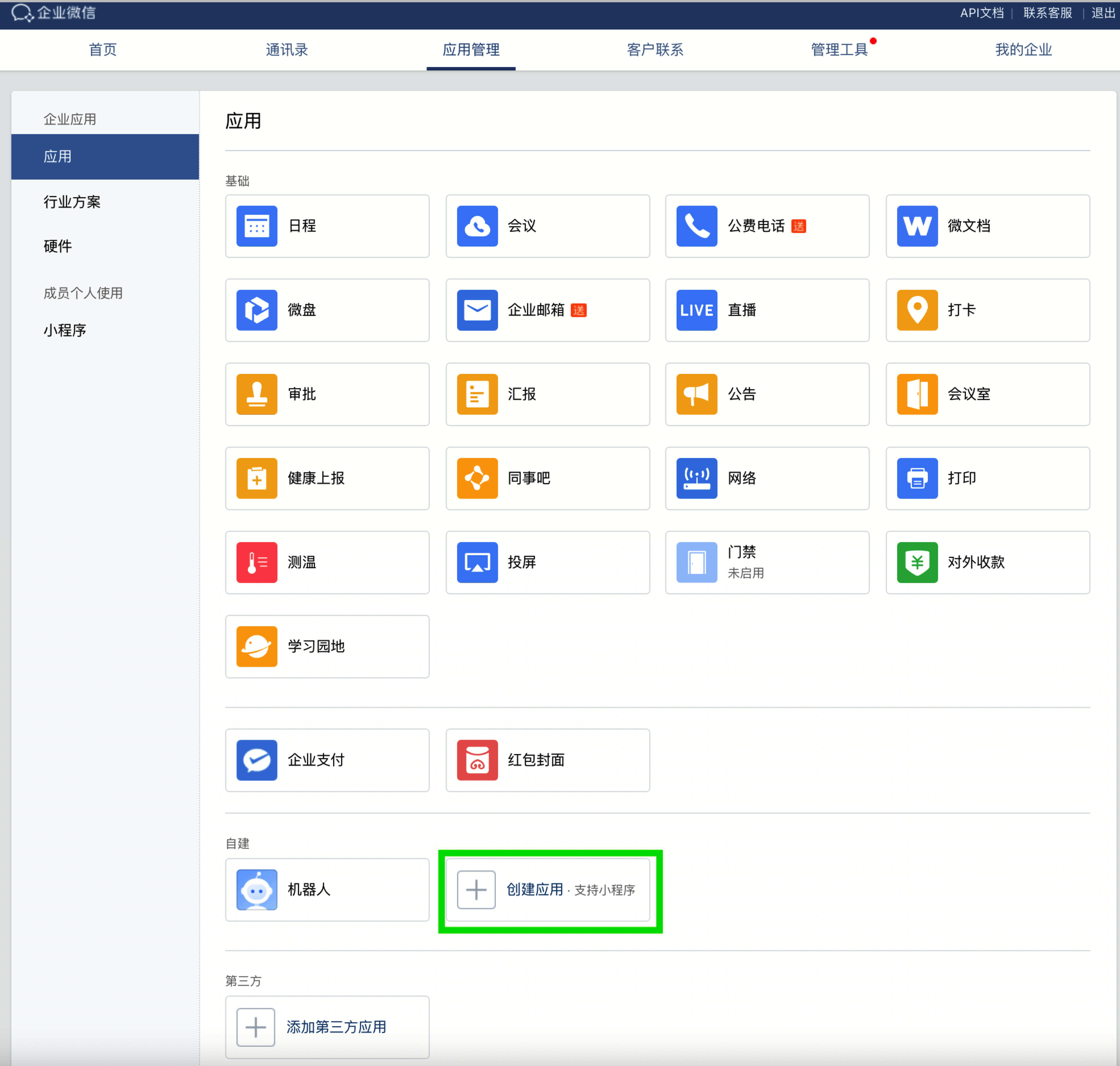 - 在应用管理页面,点击自建下的创建应用。