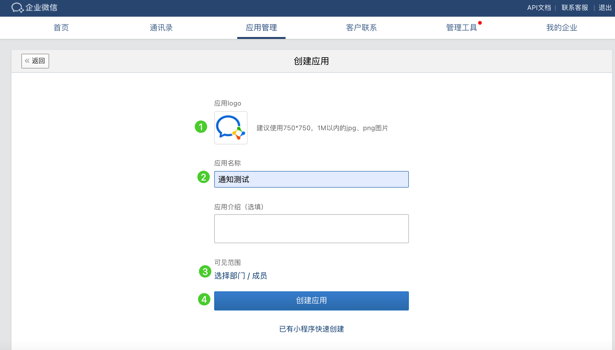 - 在创建应用页面,上传应用 Logo、输入应用名称(例如,通知测试),点击选择部门 / 成员编辑可见范围,然后点击创建应用。