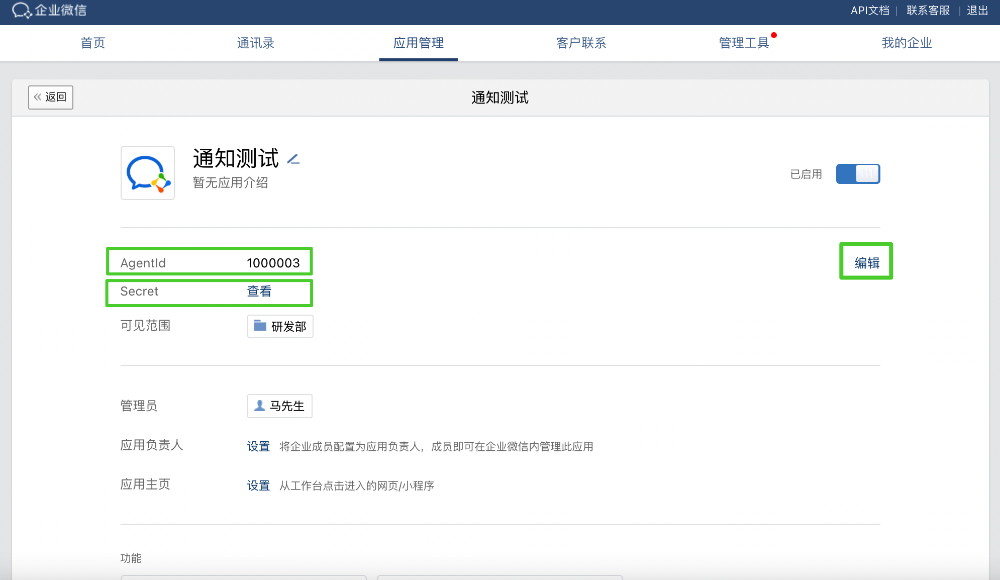 备注请确保将需要接收通知的用户、部门或标签加入可见范围中。 - 应用创建完成后即可查看其详情页面,AgentId 右侧显示该应用的 ID。点击 Secret 右侧的查看,然后在弹出对话框中点击发送,便可以在企业微信客户端查看 Secret。此外,您还可以点击编辑来编辑可见范围。