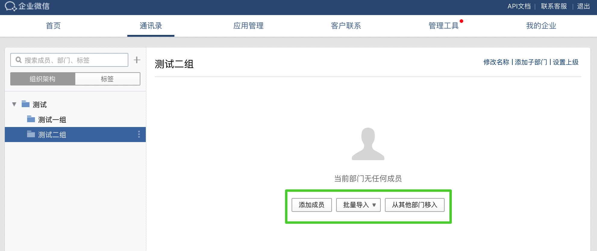 - 在通讯录页面的组织架构选项卡下,点击测试(本教程使用测试部门作为示例)右侧的