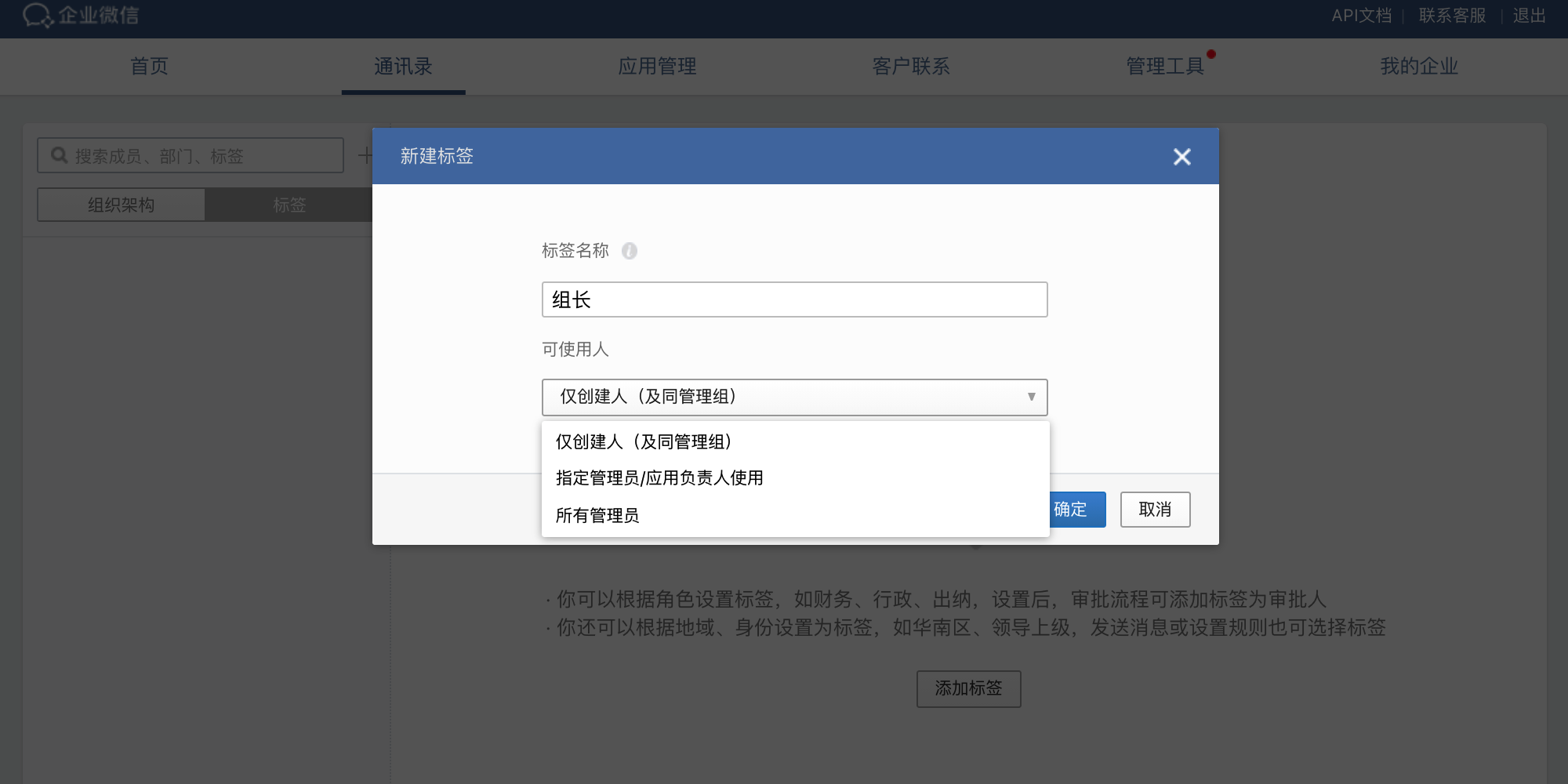 - 在弹出对话框中,输入标签名称,例如组长。您可以按需指定可使用人,点击确定完成操作。
