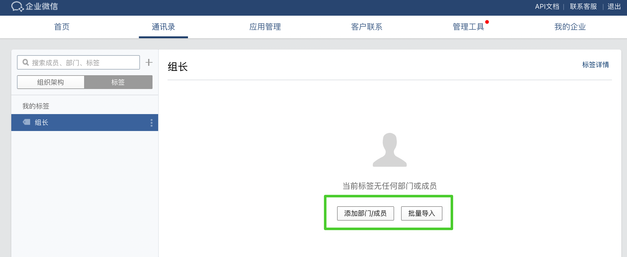 - 创建标签后,您可以点击右侧的添加部门/成员或批量导入来添加部门或成员。点击标签详情进入详情页面,可以查看此标签的 ID。