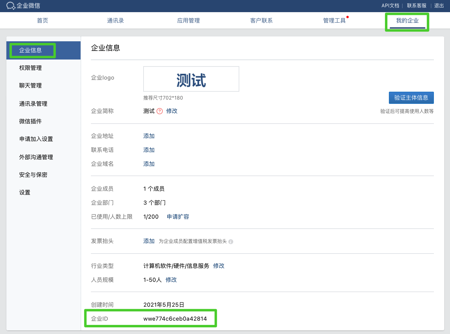 - 要查看企业 ID,请点击我的企业,在企业信息页面查看 ID。